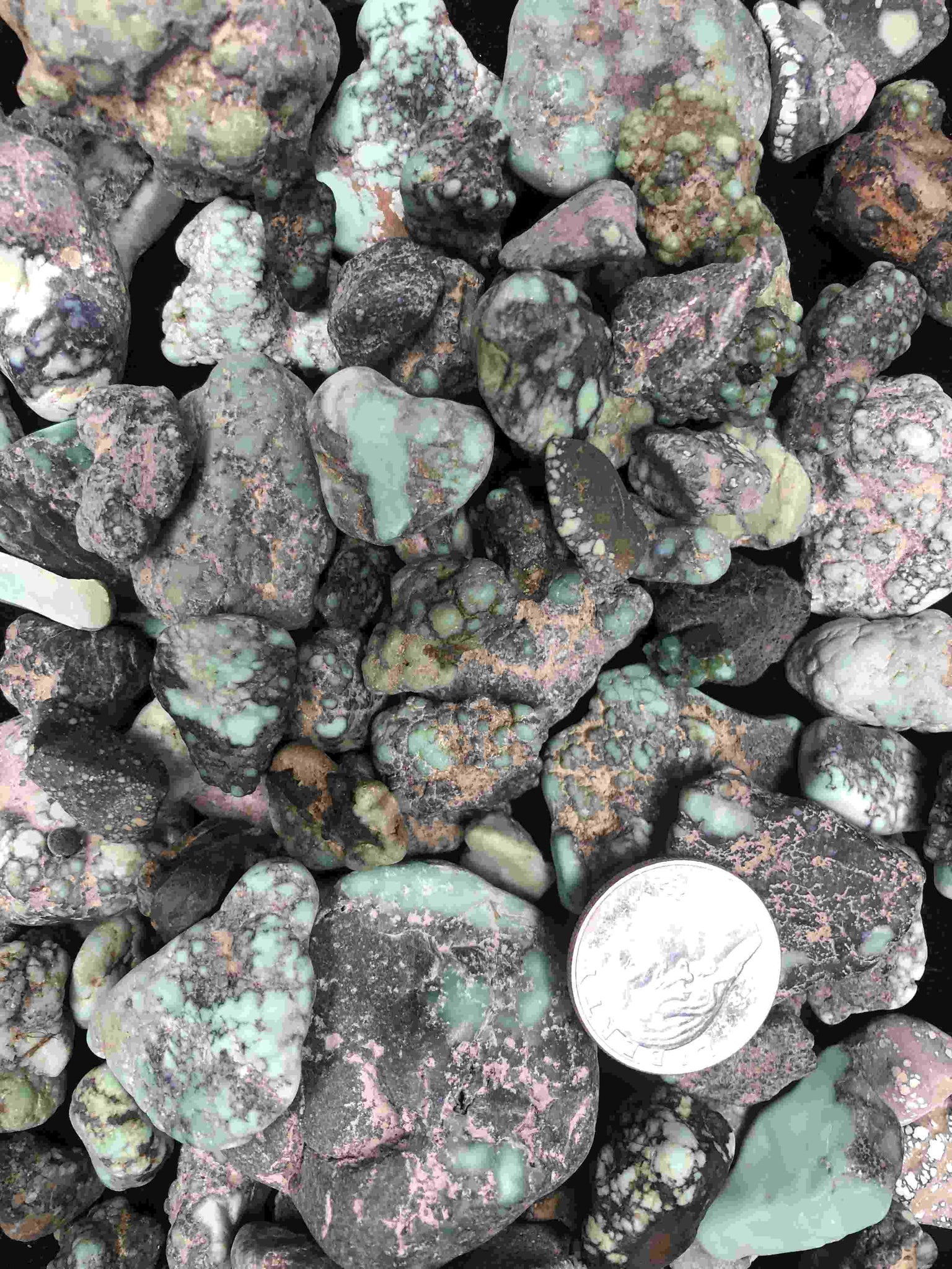 This Crescent Valley, NV variscite is excellent cutting material - a number of cutters say it's the best material they've ever cabbed. $2. gr. - 15 gr. minimum